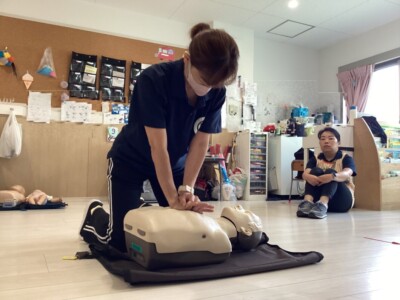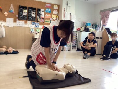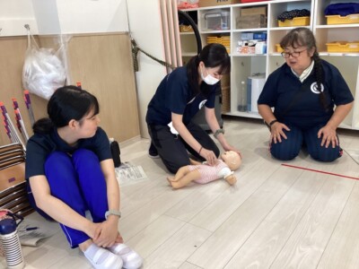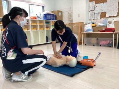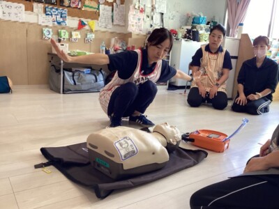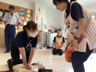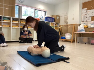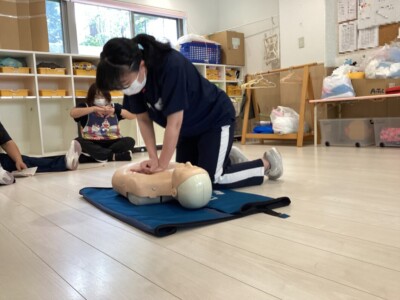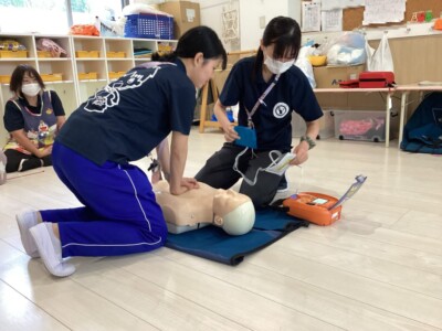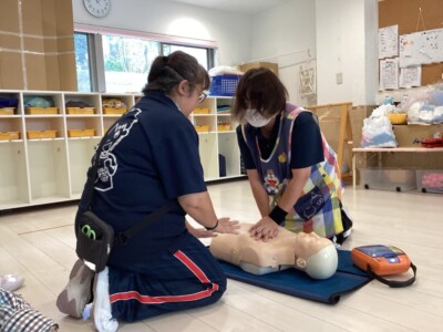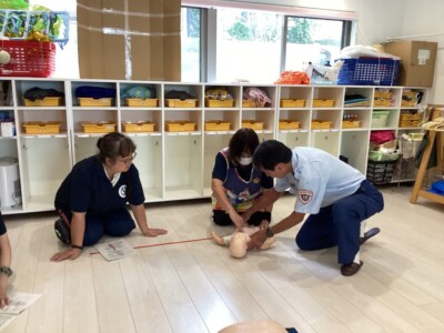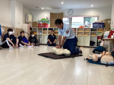 幼稚園が夏休み期間中に、先生たちは消防署の方を招いて救命救急講習を受講しました!!大人・幼児・乳児の心肺蘇生法やAEDの使い方も合わせて実技を通して、学びました✨