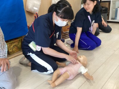 乳児(赤ちゃん)の胸骨圧迫は2本指で行います。やってみて、大変だけど助かってほしいという思いが芽生えました。