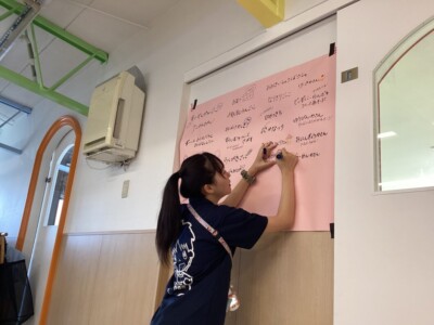 「ディズニーランドをつくりたい!」「秘密基地を作りたい!」「スライムをつくって宝探しをしたい」「段ボールで大きな消防車を作ってあそびたい」さて、どこから始めようか、子どもたちも先生たちもワクワクしながら計画を考えています。