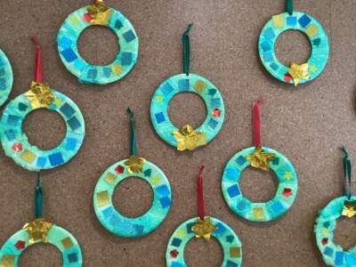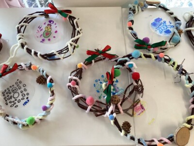 クリスマス製作で年少ぐみはかわいいリース、年中ぐみはおしゃれなリース、年長ぐみはスノードームを保育参観で作りました✨