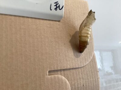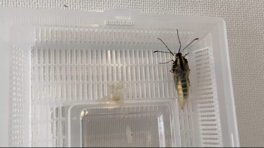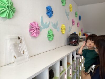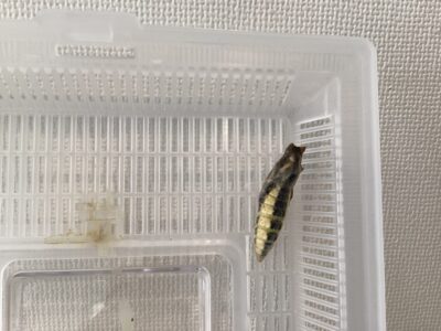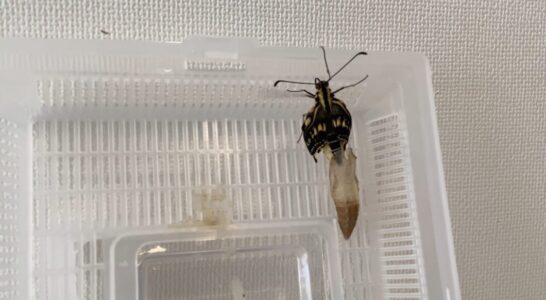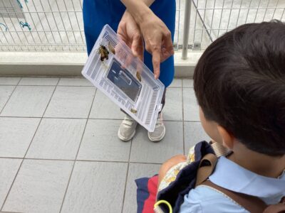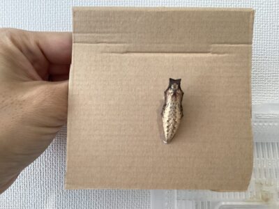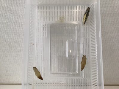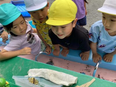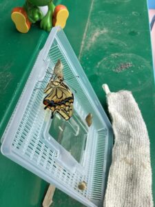 そろそろちょうちょうに羽化してるかなと週末を終えた月曜日。先生たちの朝の話題はアゲハチョウの話でした。週末はいつでも蝶になって飛べるように園庭に置いていました。何匹かは飛びだっていました。