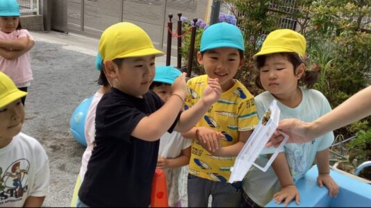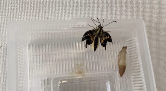 空になったさなぎは、薄く透けていました。そして、まだ蝶になる準備中のさなぎには模様があります。アゲハ蝶は黒いろのシマシマが見えます。キアゲハは黒のてんてんがみえています。そんな時、羽化がはじまりました!!先生も子どもたちも大興奮。「がんばれー」の応援の声も聞こえてきました。長い時間子どもたちに見守られながら、空に舞い上がって飛んでいきました😊