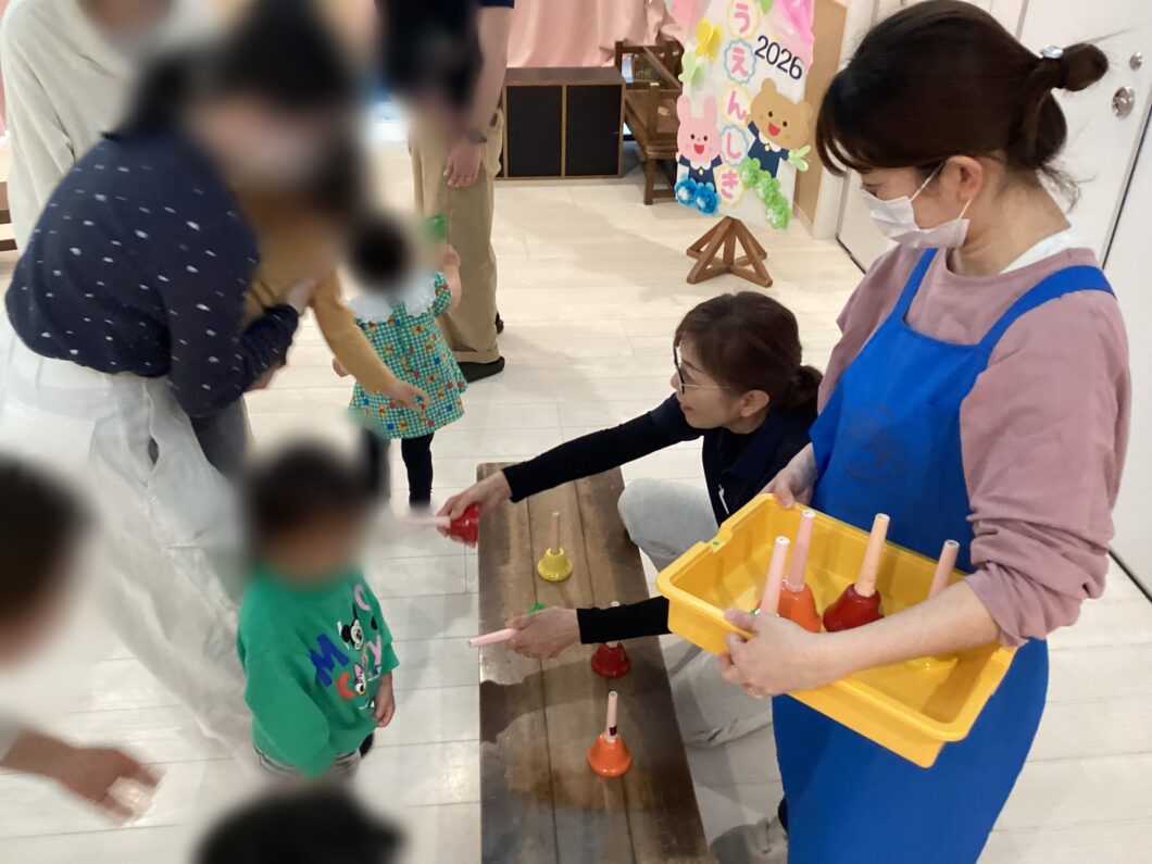 「ようちえんのうた」ではハンドベルに触れて、鳴らして楽しみました♪