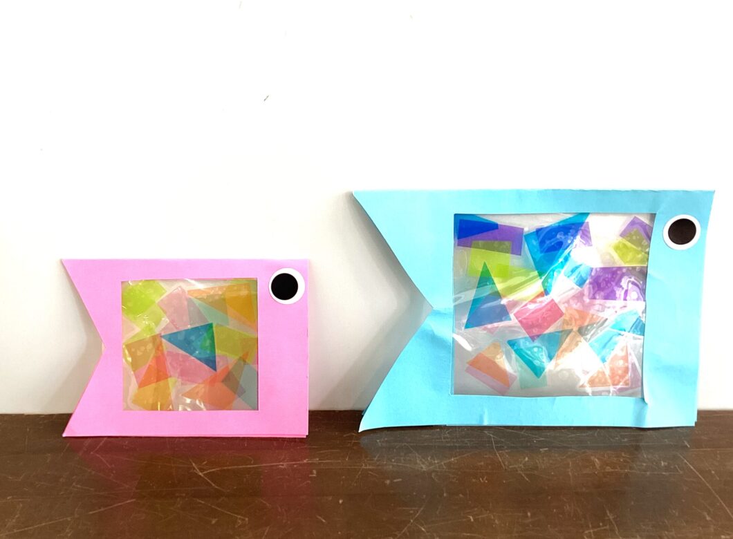 透明のこいのぼりに透き通った綺麗な折り紙をぺたぺた貼ってみました😊素敵なこいのぼりのできあがり✨