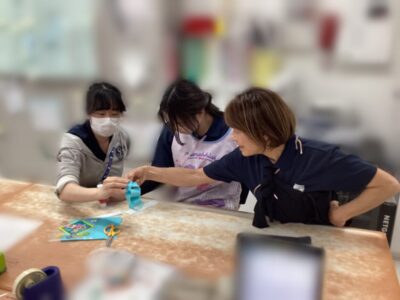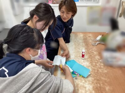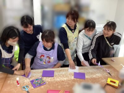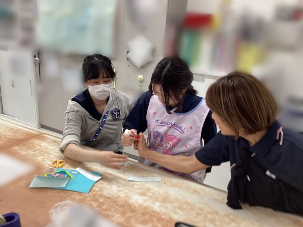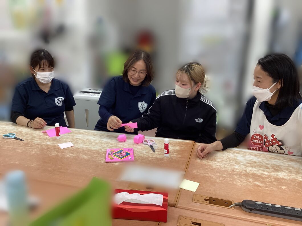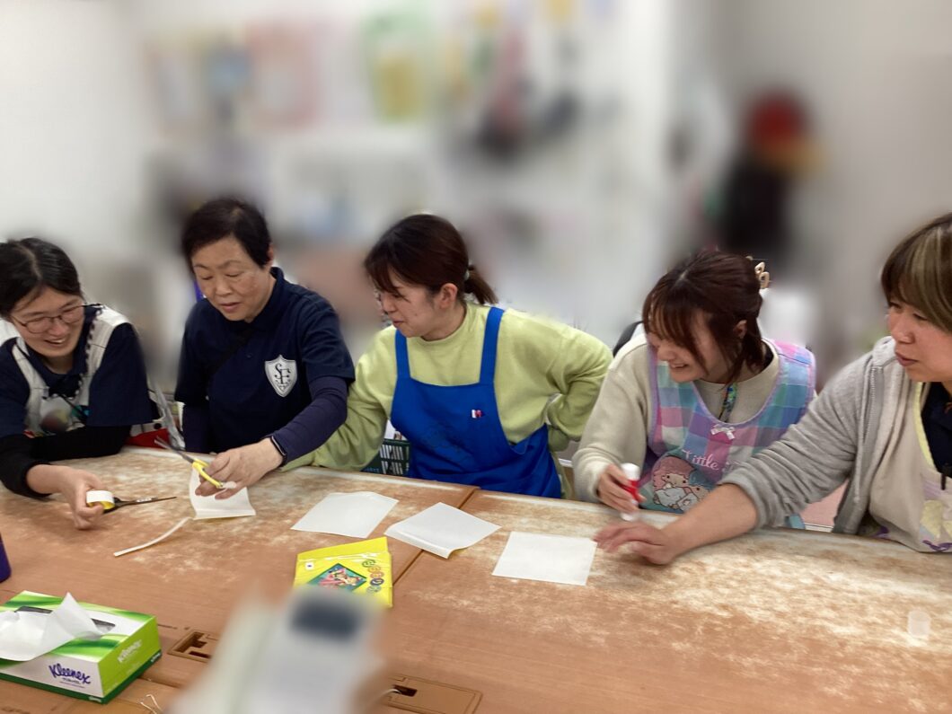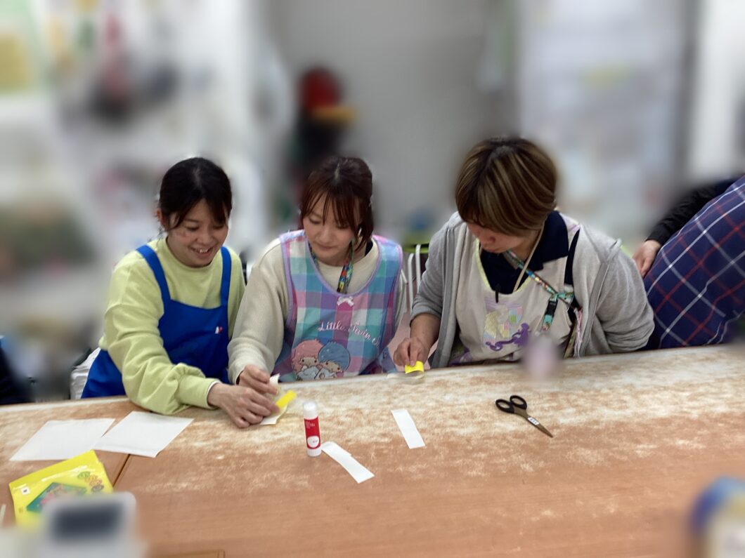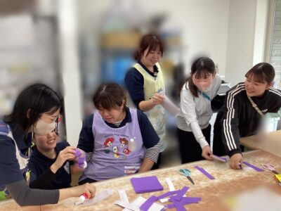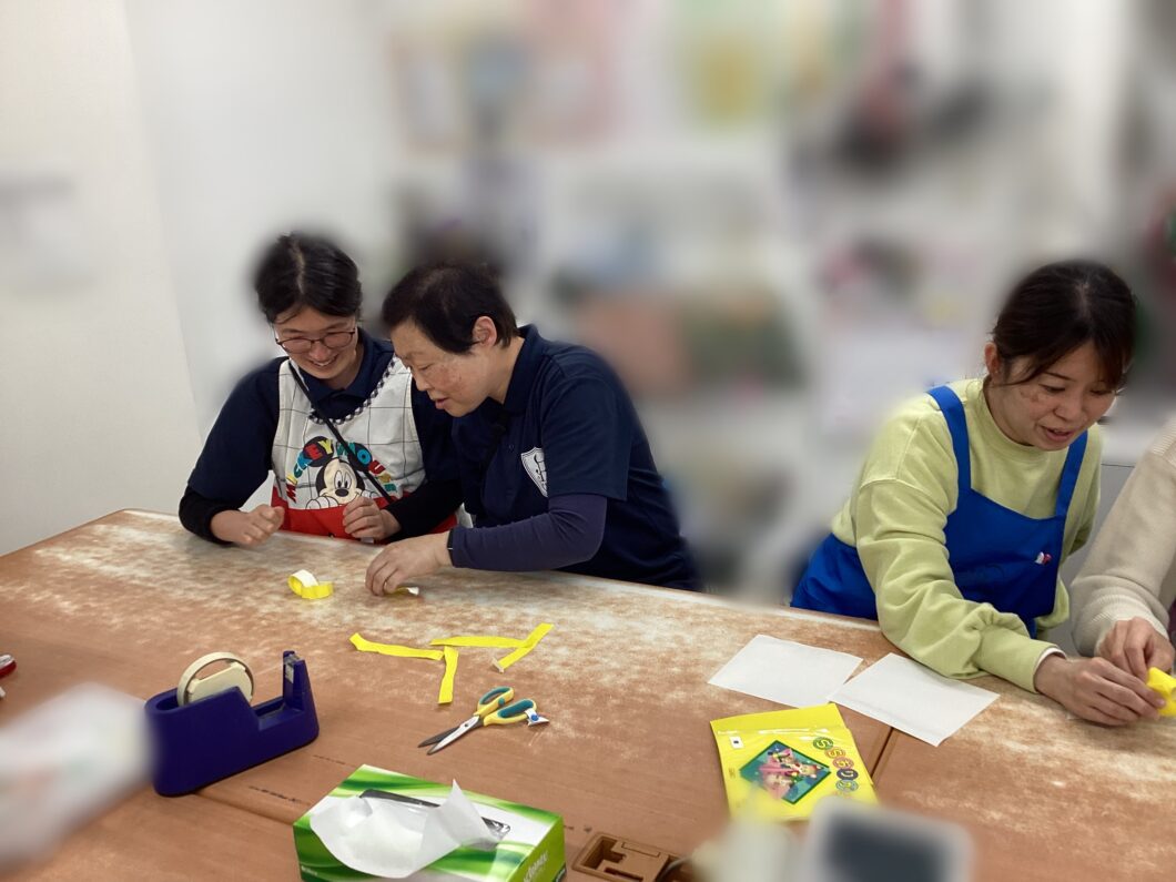 そこからワークショップです!4グループに分かれて、利き手だけ使って輪飾りを3分でどれだけ長く作れるか競争しました。制限時間の中で役割を決めたり、調整したりと大忙しで大盛り上がりで遊びができました😊