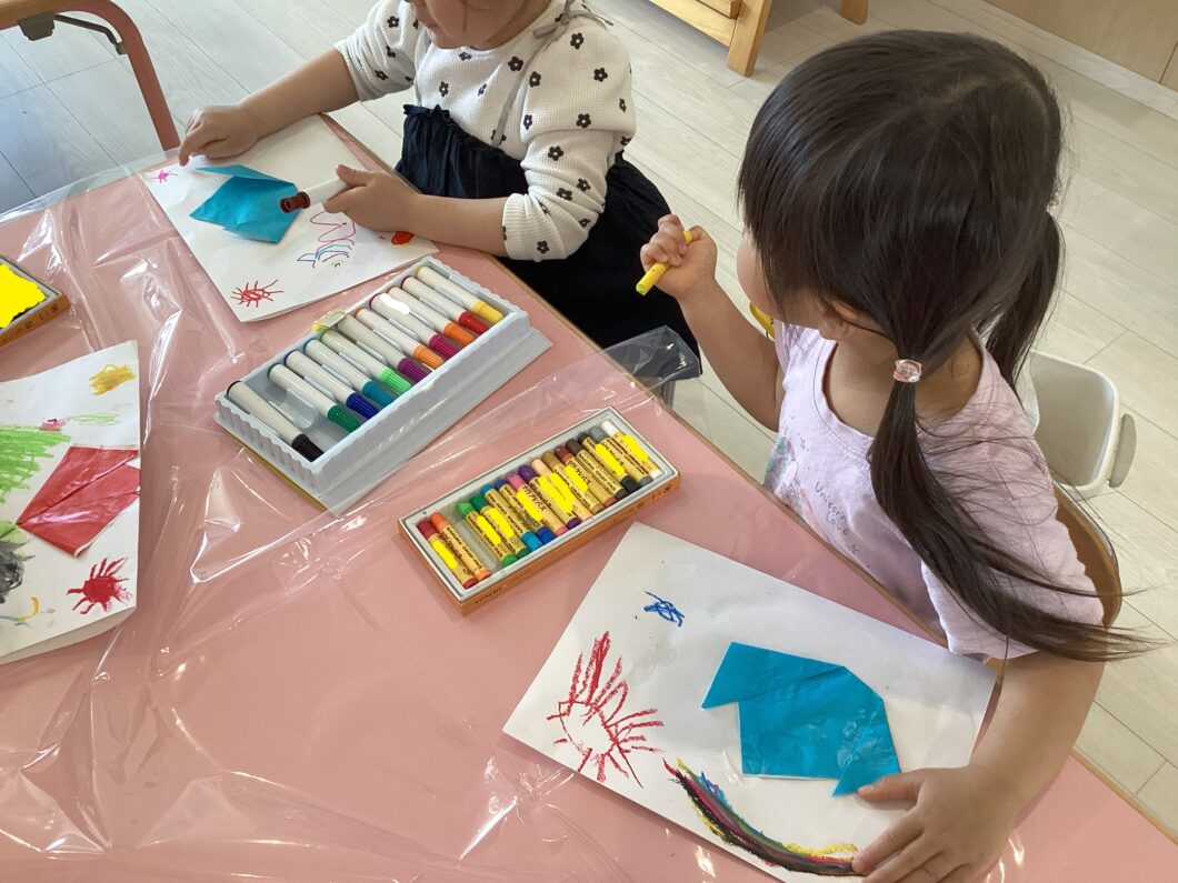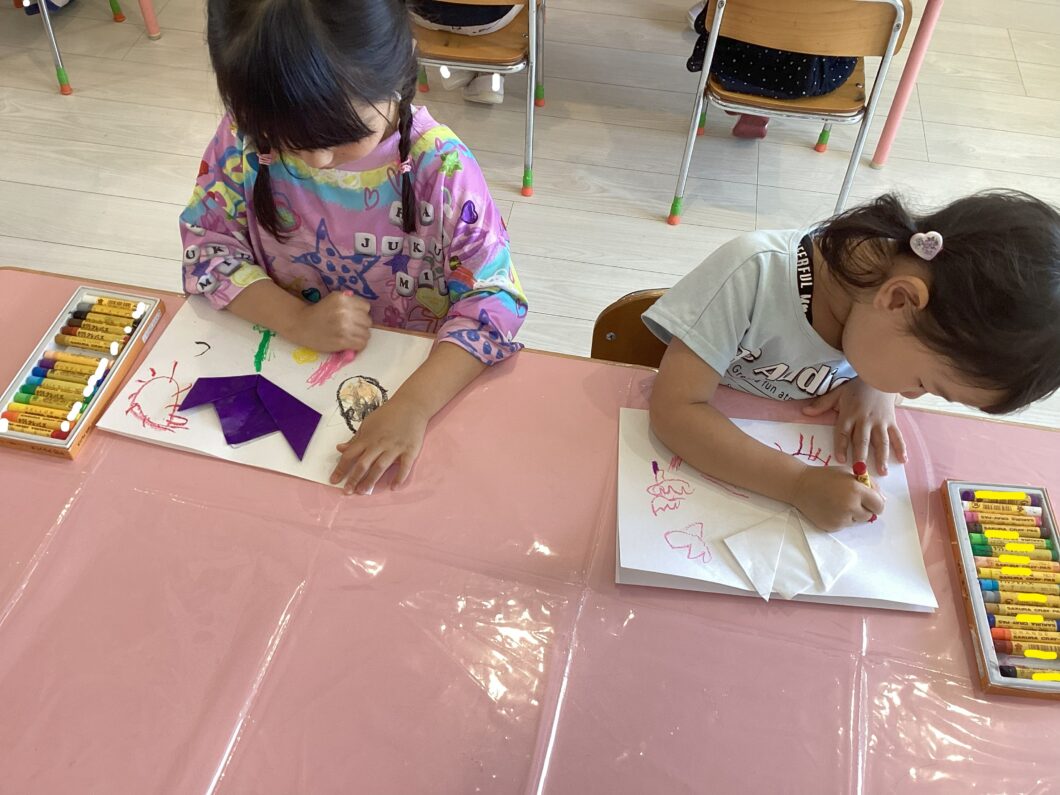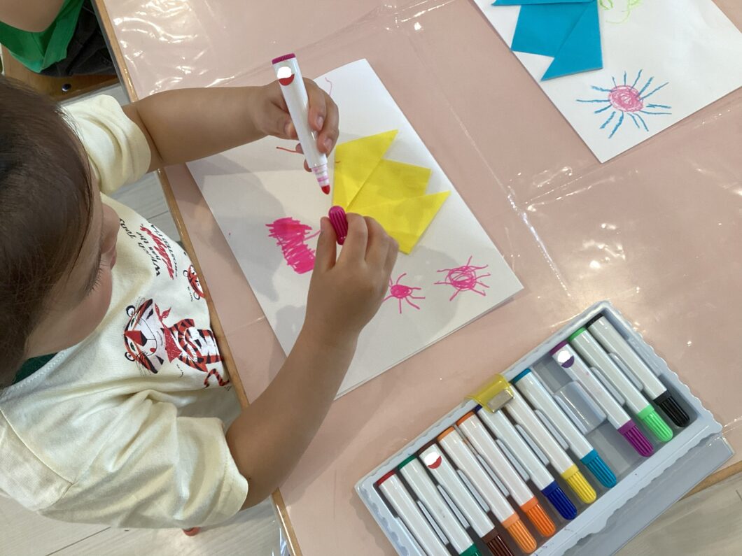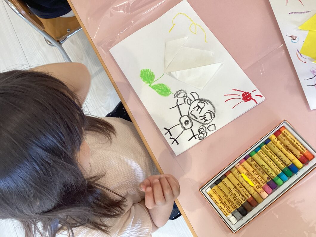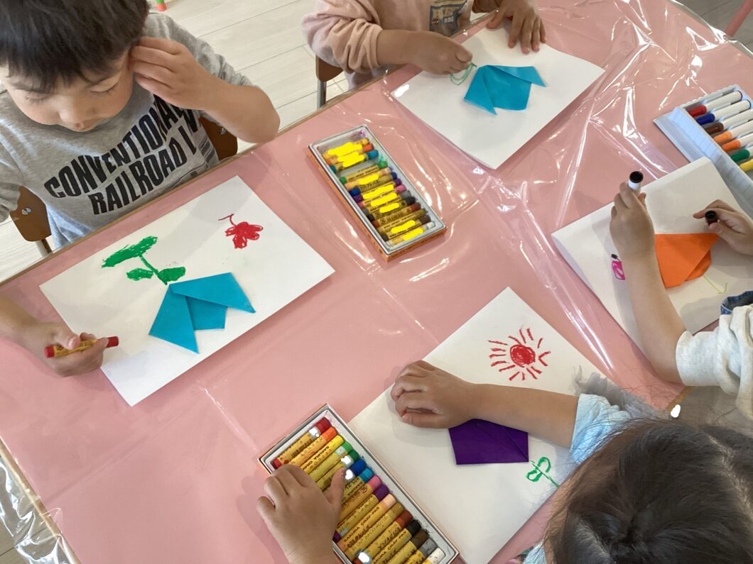 折り紙でチューリップを折ってあそびました!まわりにちょうちょうや他のお花を描いて春を感じながら楽しみました😊