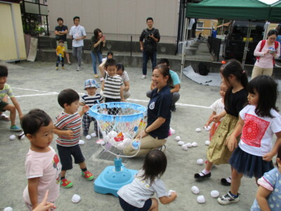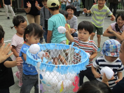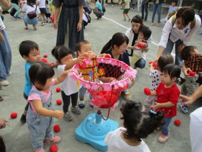 まずは玉入れ!!赤と白にわかれて、赤玉と白玉をいっぱい入れました♪