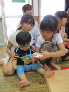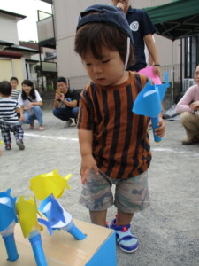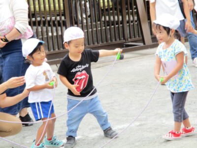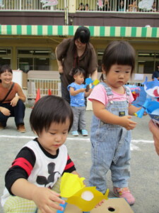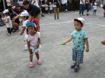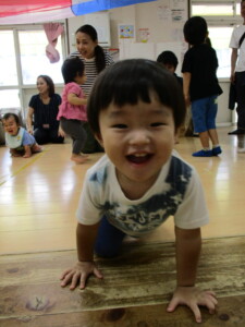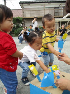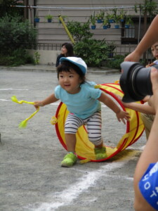 2歳クラスは、トンネルくぐってかけっこ競争!!それからしっぽとりゲームをしました♪
