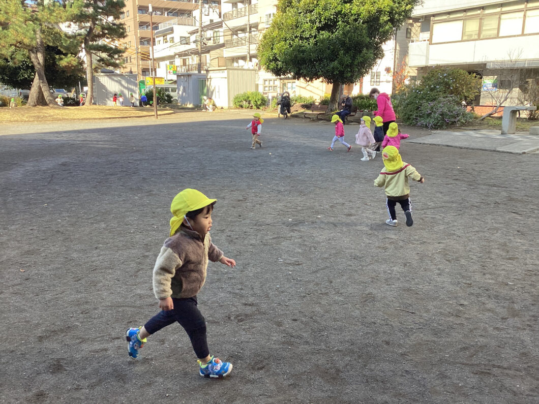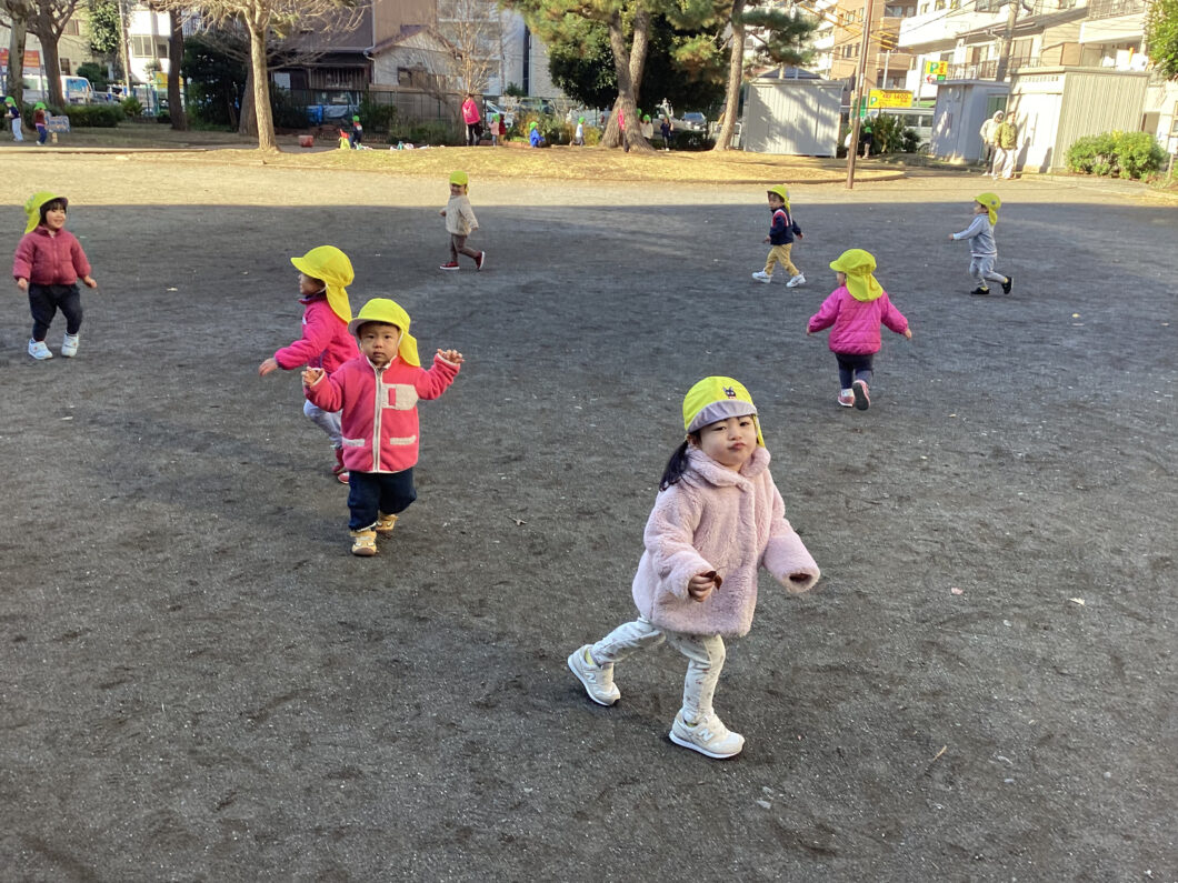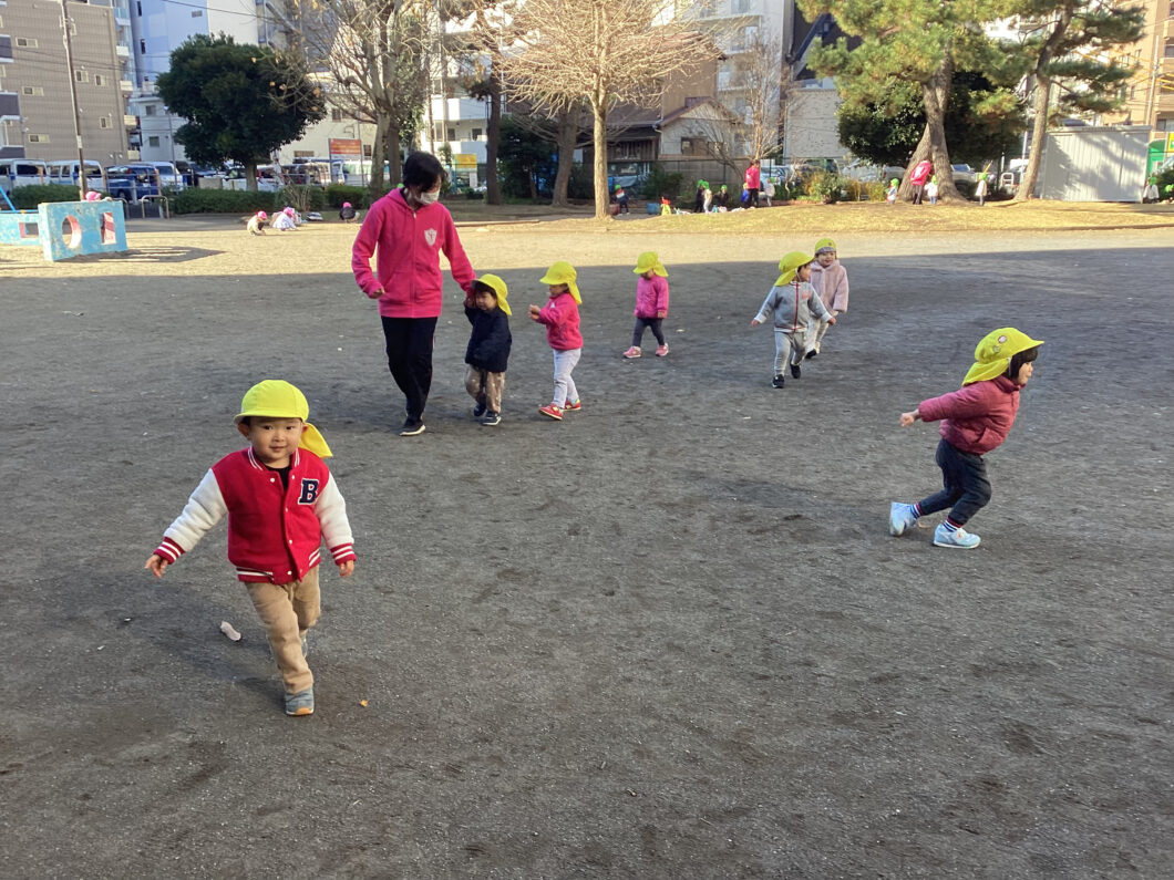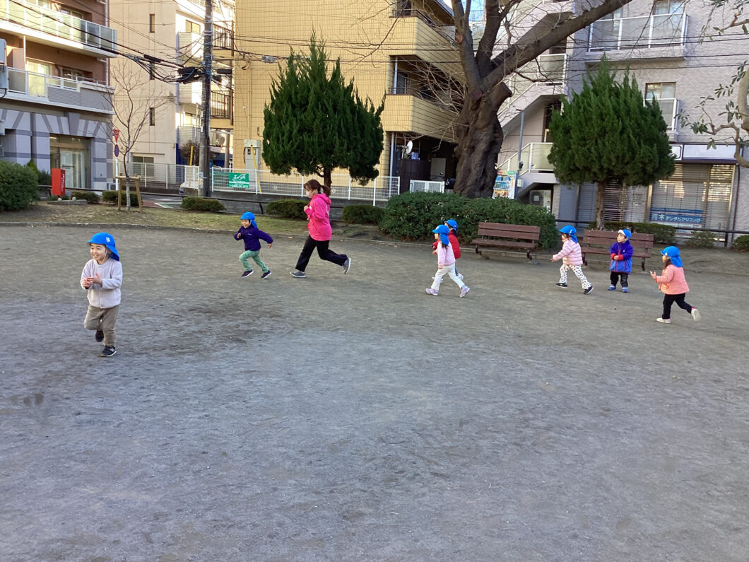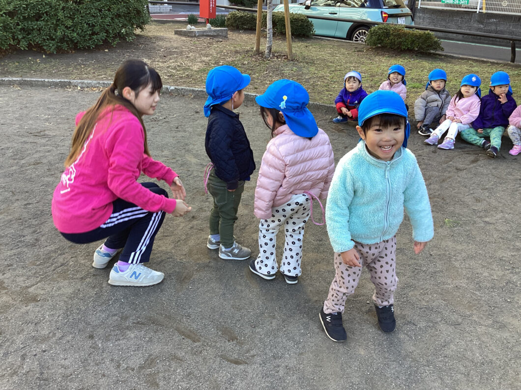 保育士の後ろについて「1・2・1・2」とマラソンをして身体をあたためます😊