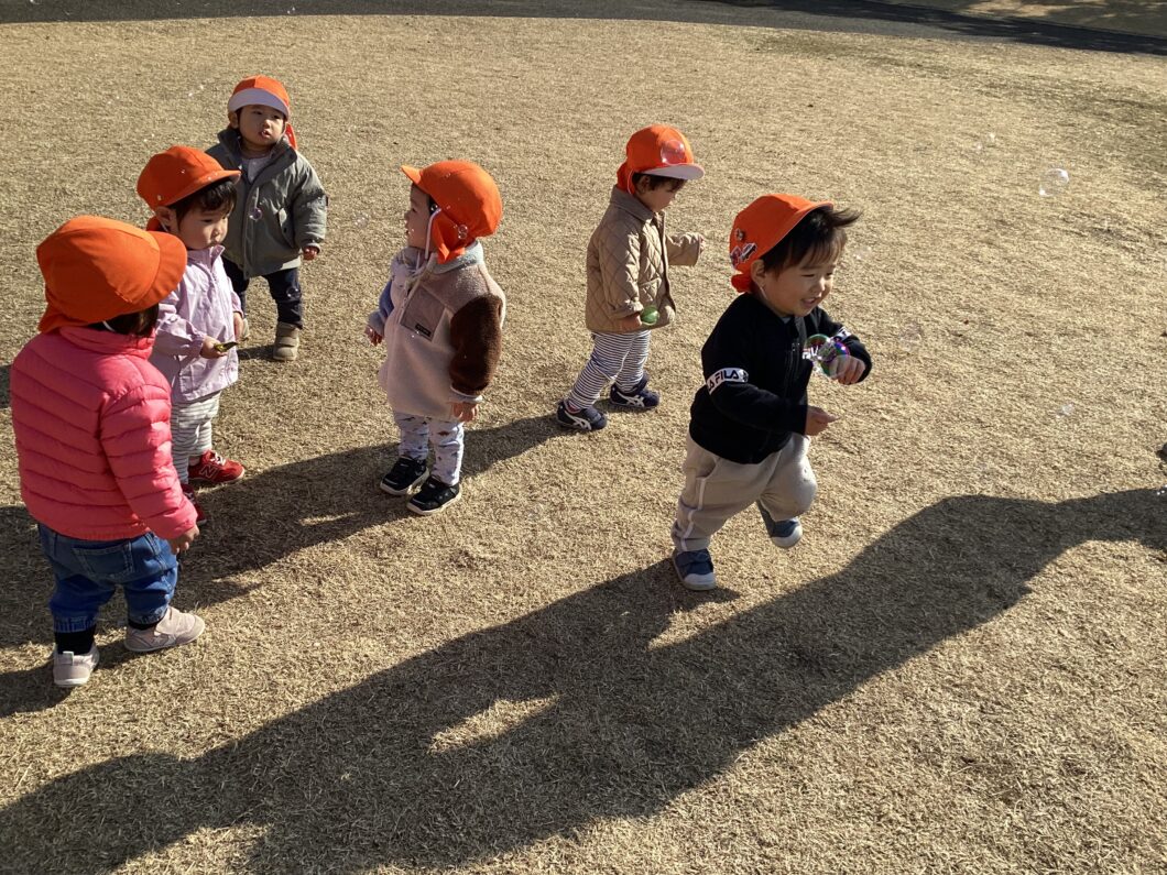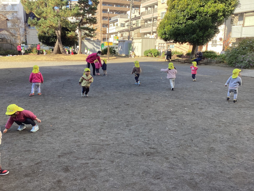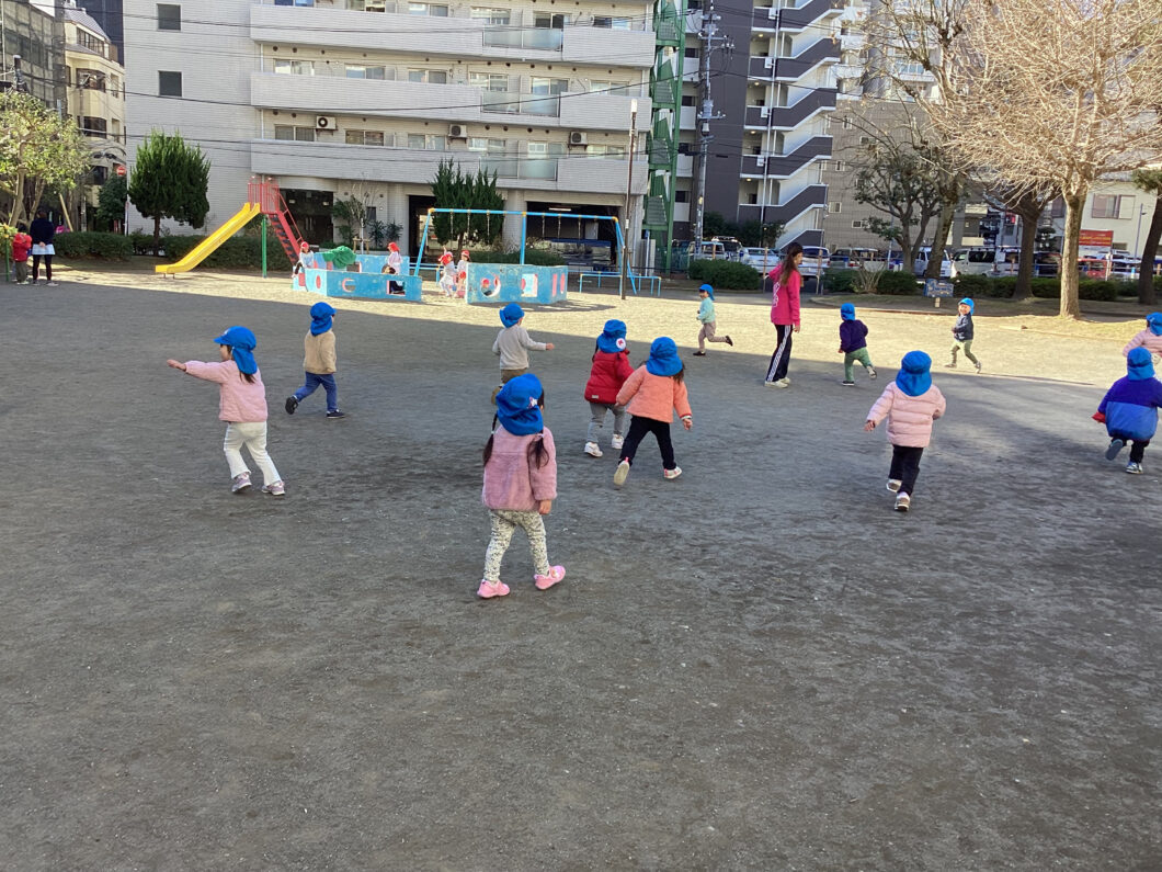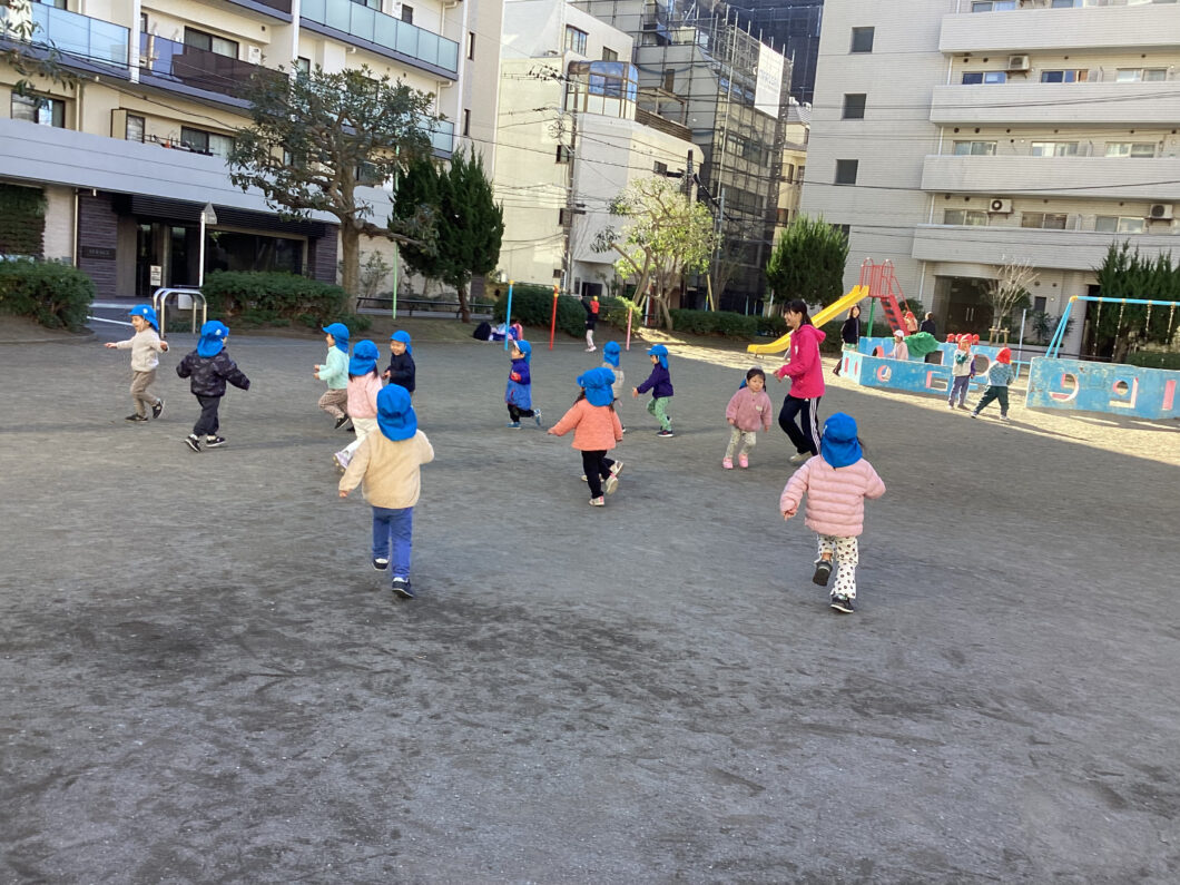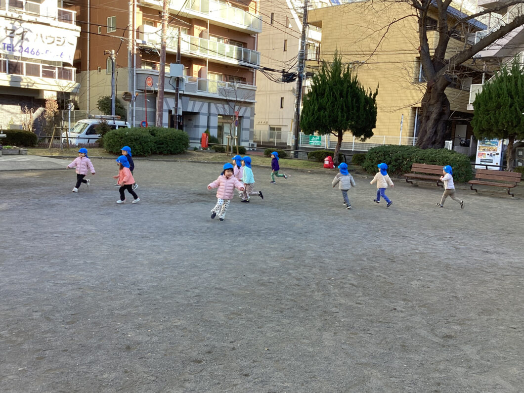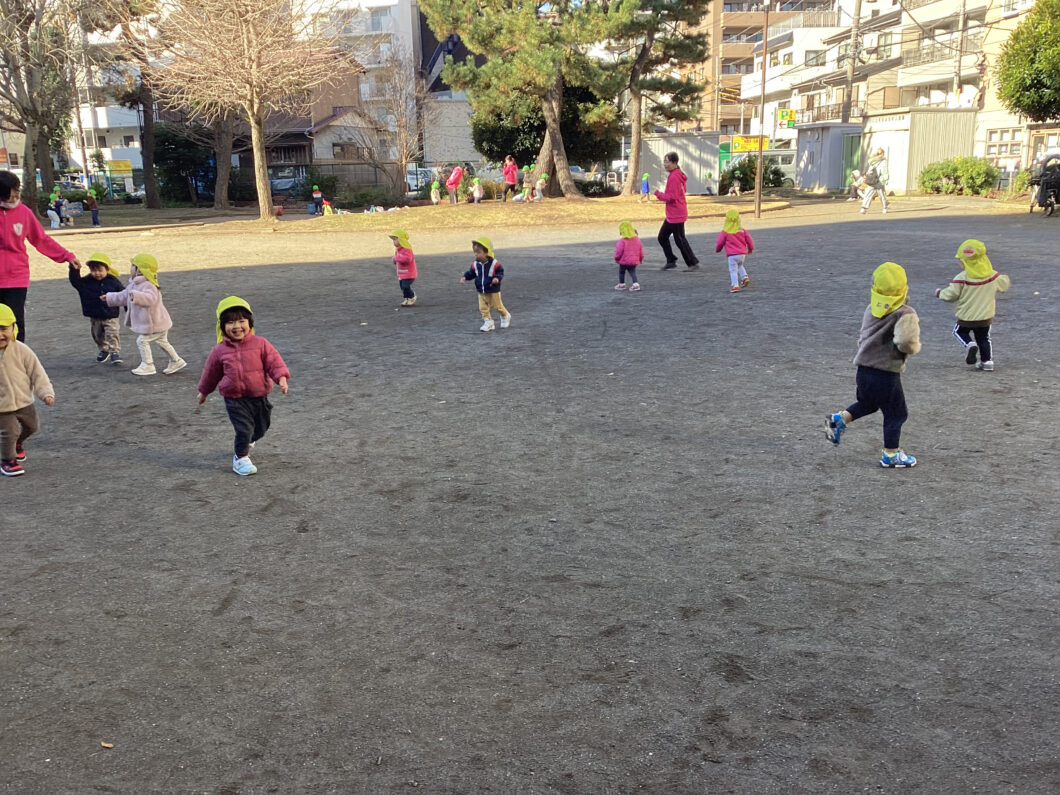 保育士の後ろについて「1・2・1・2」とマラソンをして身体をあたためます😊
