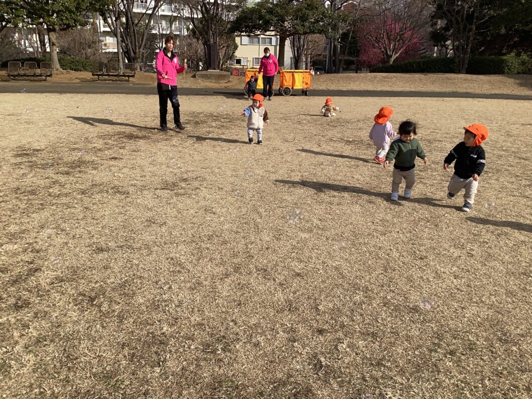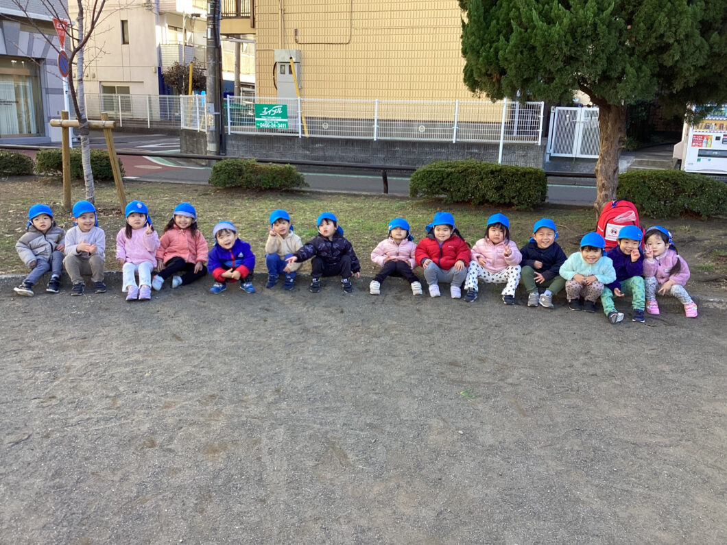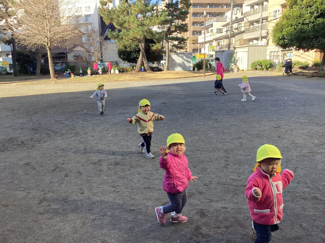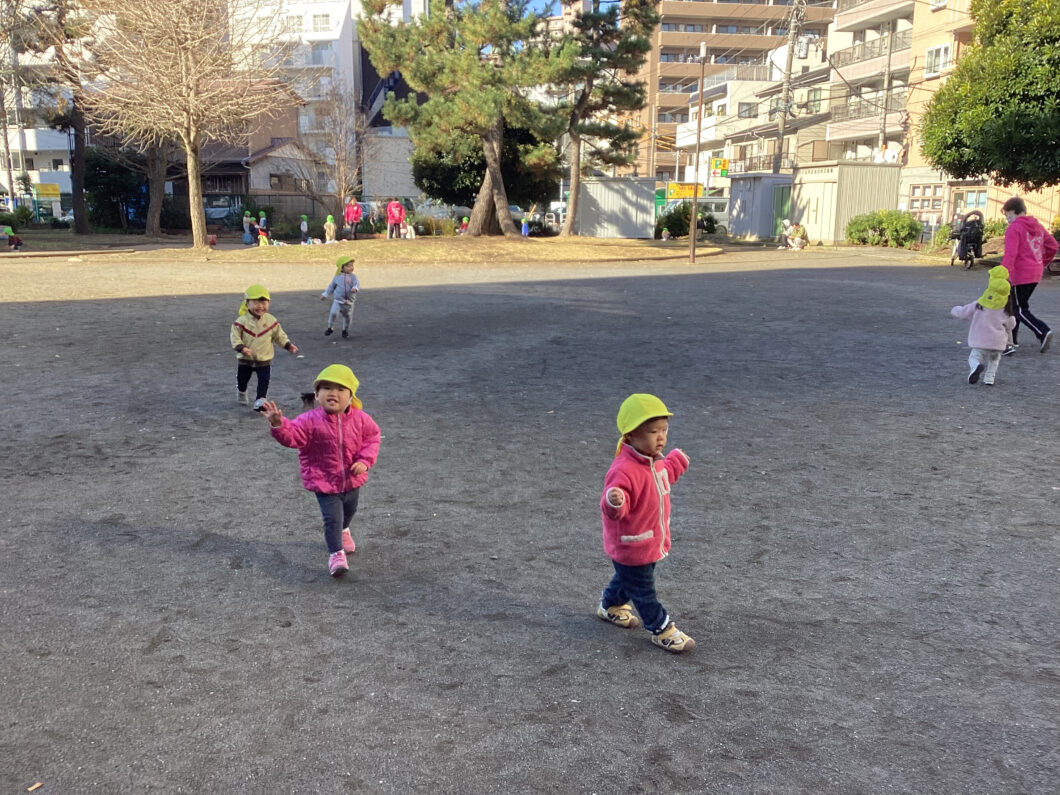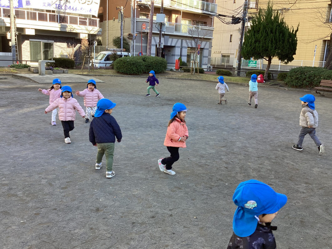 保育士の後ろについて「1・2・1・2」とマラソンをして身体をあたためます😊