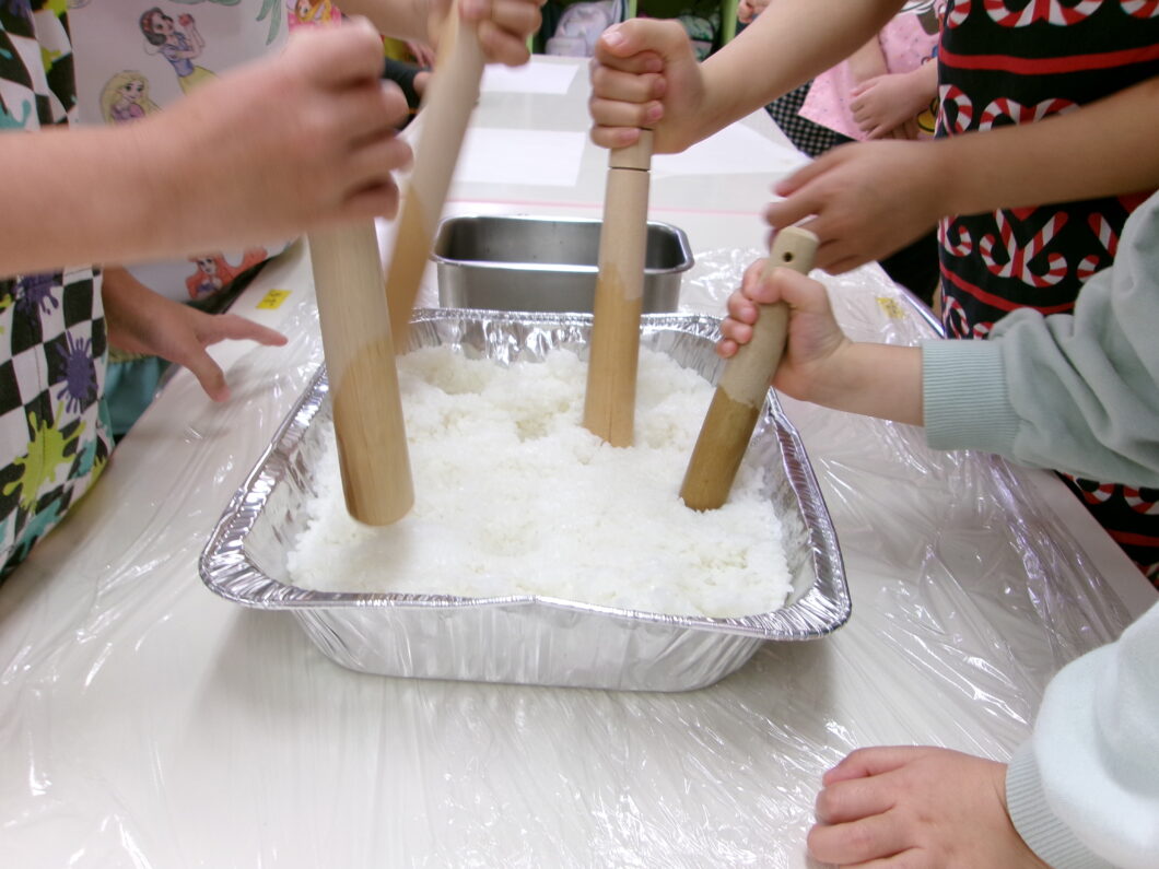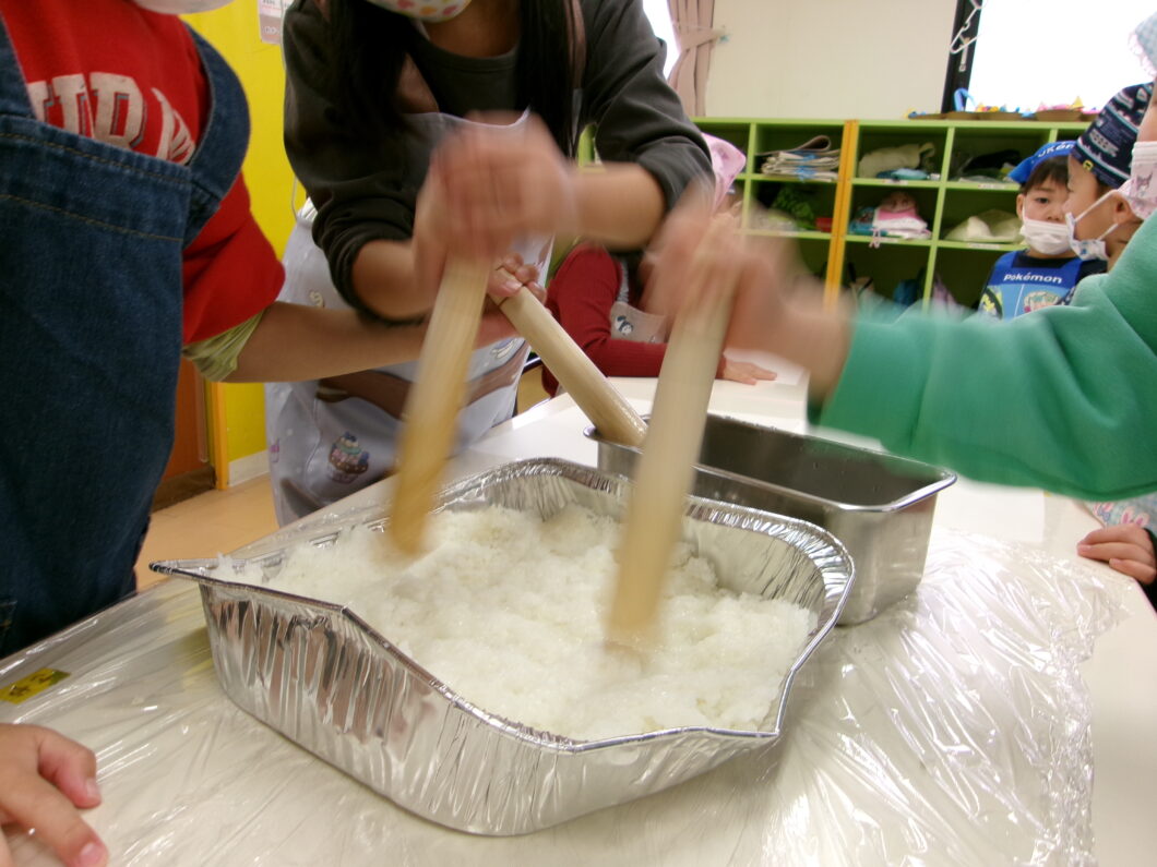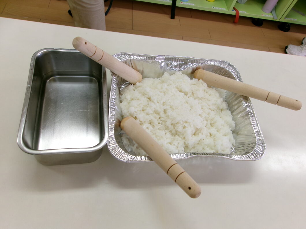 ⓵まずは「おいしくなーれ♥️」のおまじないをかけながら✨ ホカホカのご飯をトレーに入れて「すりこぎ棒」を使ってすりつぶします😊 少し力が必要ですがみんな上手に潰せていました👌 おまじないを口ずさみながらとてもかわいい子どもたち🎵