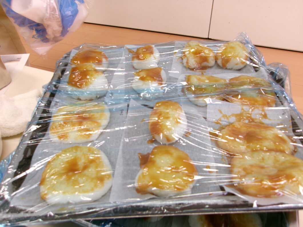 炊きたてのご飯を軽くつぶし、薄い板につけて、わらじのような楕円形に整えたものや、小さな丸いおにぎり(まんじゅう)にしたものを串にさして焼きかためます。